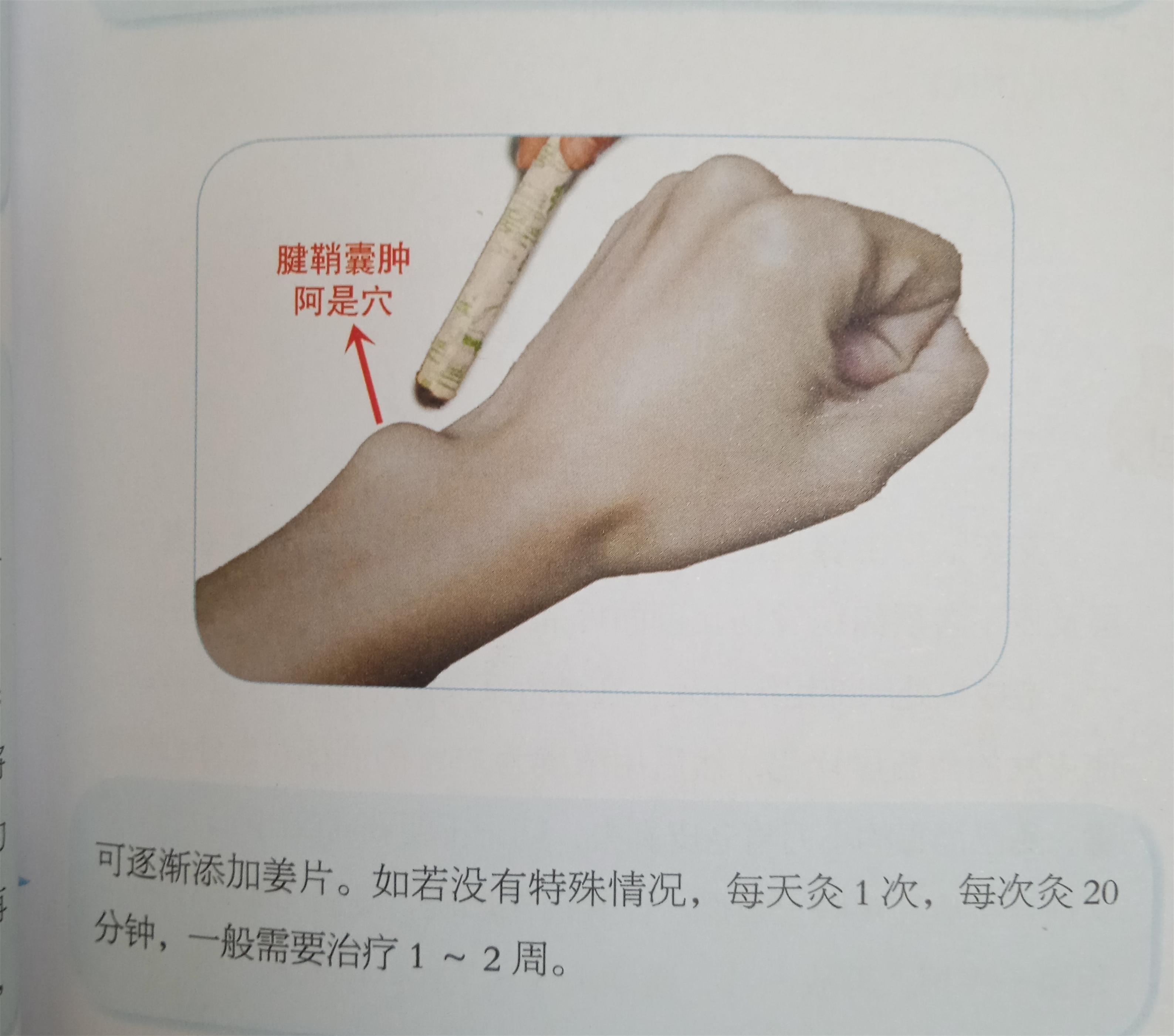 25腱鞘炎囊肿1.阿是穴每天20分钟悬灸。2.隔姜灸灸到潮红。3.一般需要1~2周