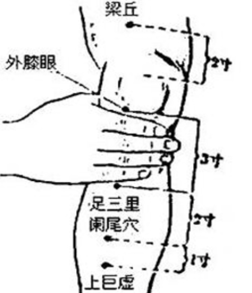 24阑尾穴足三里穴下两寸,有压痛点。悬灸20~30分钟皮肤红润为宜,患者自觉阵阵的热力向肌肉窜入,每天1~2次。
